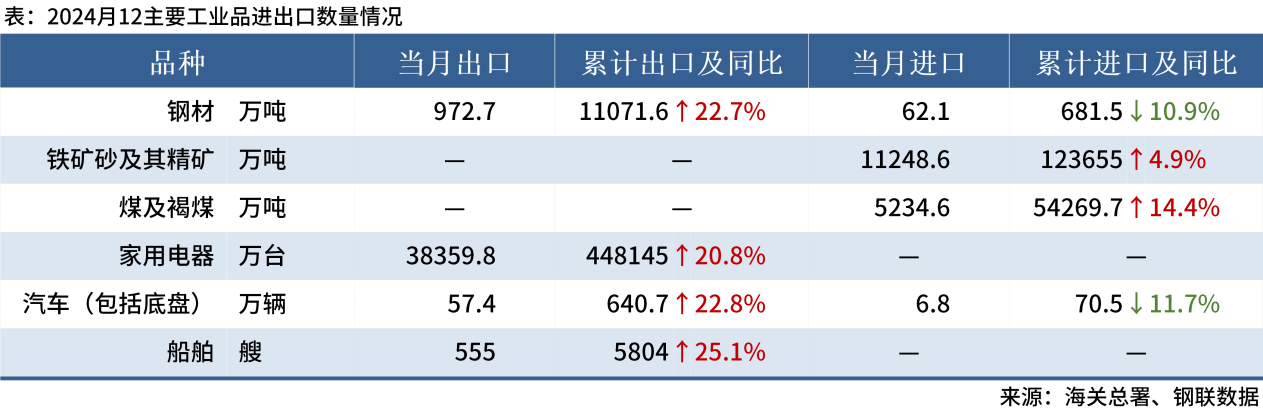 ◎ 海關(guān)總署數(shù)據(jù)顯示,2024年12月中國出口鋼材972.7萬噸,較上月增加44.9萬噸,環(huán)比增長4.8%;1-12月累計(jì)出口鋼材11071.6萬噸,同比增長22.7%,創(chuàng)9年新高。其他主要品種進(jìn)出口情況: