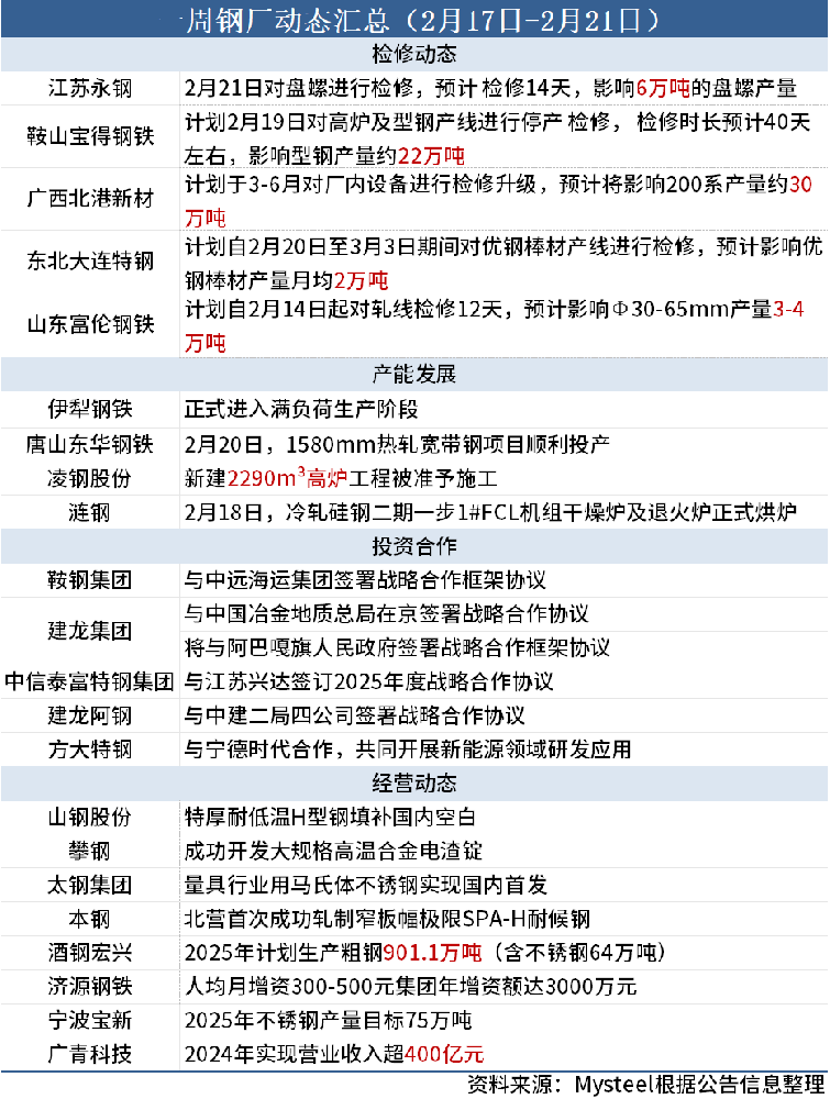 據(jù)Mysteel不完全統(tǒng)計(jì),本周(2月17日-2月21日)5家鋼廠發(fā)布檢修信息,具體如下:
