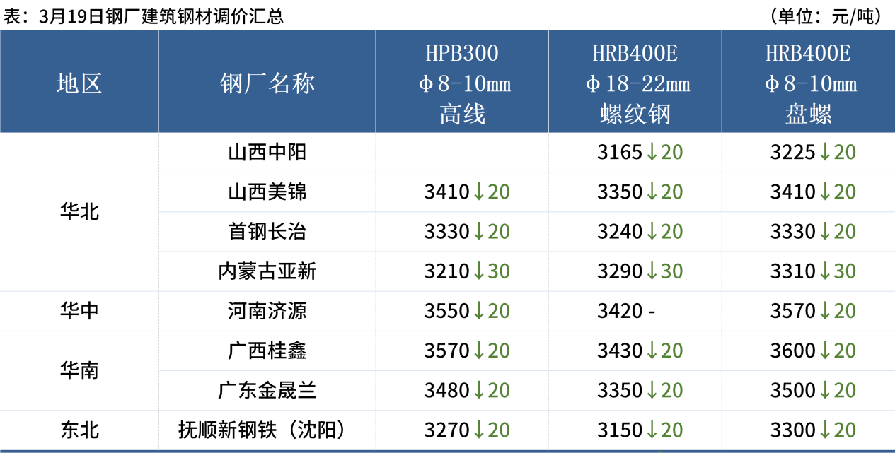 ◎ 3月19日,江蘇沙鋼廢鋼采購價格下調(diào)30元/噸,調(diào)后重三含稅2370元/噸,爐一含稅2450元/噸。