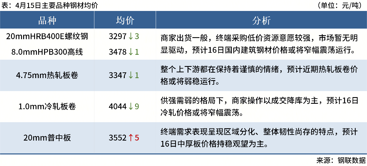 ◎4月15日,全國主港鐵礦石成交90.80萬噸,環(huán)比減6%;237家主流貿(mào)易商建筑鋼材成交11.07萬噸,環(huán)比減6.3%。