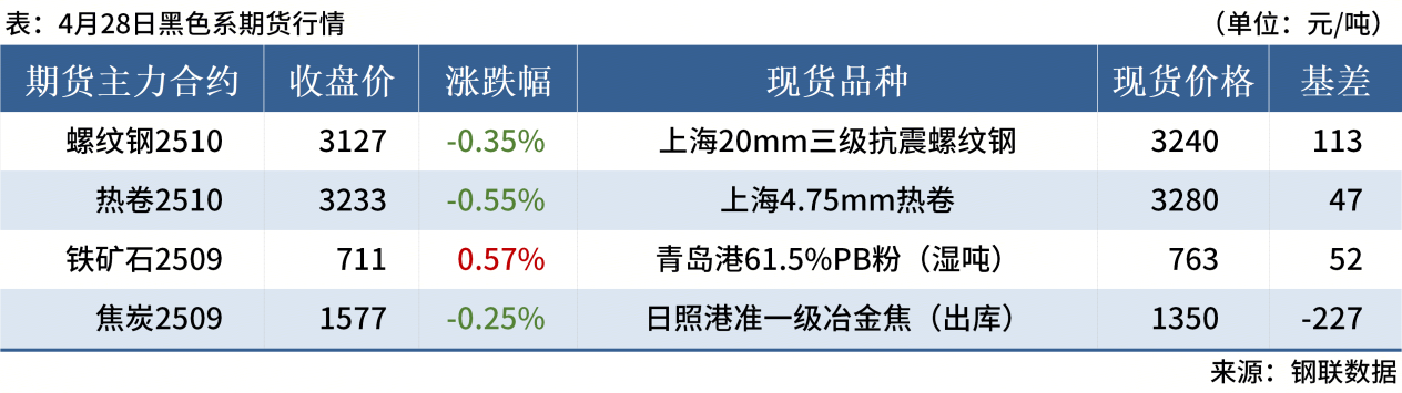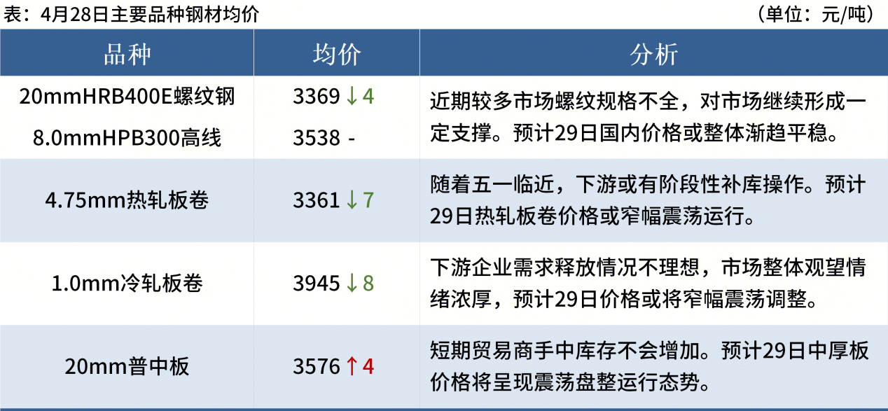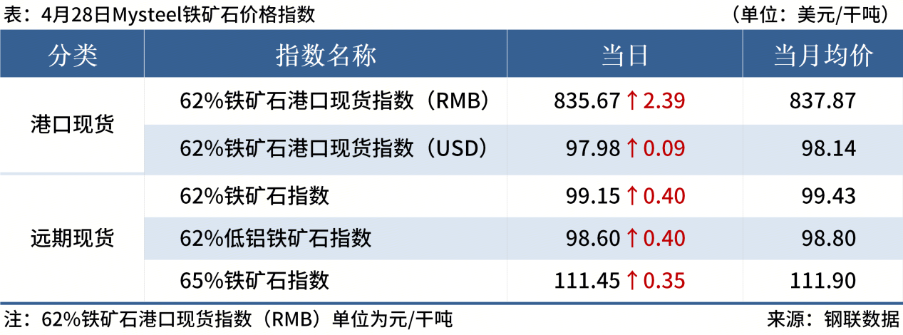 ◎ 4月28日,全國主港鐵礦石成交96.17萬噸,環(huán)比增214.3%;237家主流貿(mào)易商建筑鋼材成交12.05萬噸,環(huán)比減0.7%。